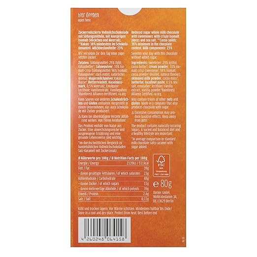 რძიანი შოკოლადი მარილიანი კარამელით, შაქრის შემცვლელი დამატკბობლით, ქსილიტოლით.