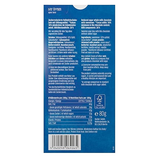 რძიანი შოკოლადი შაქრის შემცვლელი დამატკბობლით, ქსილიტოლით.